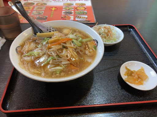 Read more平日ランチタイムに行きました。中国の方がやっているお店で大きな声で中国語が飛び交ってます。接客の女性の方はとても愛想は良いです。ランチメニューもラーメンセットも凄いボリュームで安いです。五目ラーメンを注文しました。野菜や海鮮など具の種類は多い。味も私好みで美味しい。量も多くセットにしていたら食べきれなかったかも。男性には良いと思います。テイクアウトも出来るのでニンニクチャーハンと酢豚を買って帰りました。チャーハンは味がしっかりしていて香ばしく美味しい。酢豚はお肉がゴロゴロで少し甘め。もう少し酢がきいていたら最高。 お気に入りのお店が出来ました。 テイクアウトで待ち時間の間にスープや水のサ...