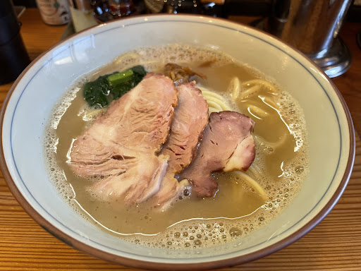 Read more時間的にも丁度良いし、久しぶり公園前に行きました。 店着10:45既に20名程並んでいます。 さすが人気店、お店に入る迄に50分掛かりました。 食券を自販機で購入するスタイルで席はカウンターのみ8席です。 店内はメンテナンスが行き届いた清潔感有るお店です。 今日は限定の豚骨煮干しラーメン¥1000+大盛り¥150をオーダーしました。 待つ事5分で着丼 大盛りを頼みましたがカワイイ丼です。 先ずはスープ、豚骨ですが綺麗に洗った豚骨を煮込まれているのでしょう臭みは無く煮干しのザラザラ感も有りませんが、豚骨煮干しはとても濃厚で昆布、あご出汁、鰹節の効いた美味しいスープです。 麺はもっちり太ストレート麺で濃厚スープにピッタリ 太麺を大盛りにすると麺間に茹で汁が残っている事が有りますが一切無しです。湯切りする所を見ておくベキだった。 具は焼豚3枚、法蓮草、メンマにネギ 焼豚は塩で下味したロース肉をロースト後に桜チップかなぁ燻製にしていると思います。 とても香りの良い焼豚です。 メンマは小さいがちゃんとふっくら煮込まれていて美味かった。 久しぶりに丼を空っぽにして帰りました。 ご馳走様でした。
