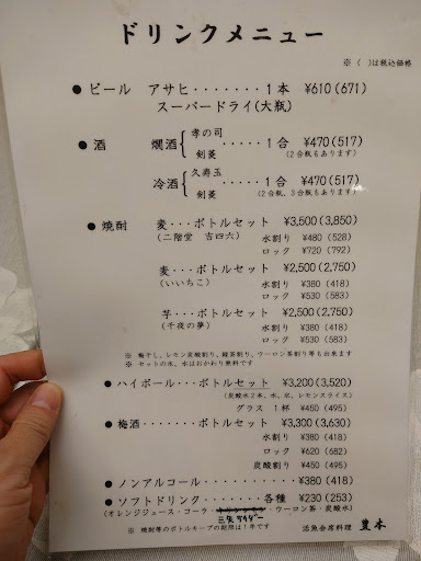 仕事関係の宴会で伺いましたが、食べ物は4,000円のコース、ドリンクは単品注文。 ドリンクはビール、焼酎、ハイボール、梅酒などあります。