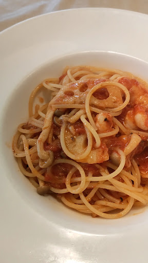ABCDとコースが別れてて、今回はDコースを選びました。前菜はお肉、お魚、野菜の3種類から選べます。 メインはスパゲッティとピザから選べますが、ピザは追加料金がかかります。デザートも何種類からか選べます。 スパゲッティを選びましたが、アルデンテよりもかたくてちょっとイマイチ…。デザートはおしゃれに盛り付けられていておいしかったです。
