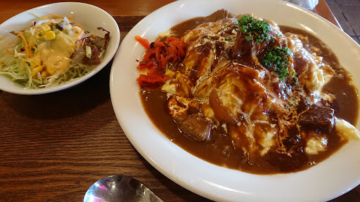 オムカレーをいただきましたが、予想外のお肉ゴロゴロが嬉しかったですね。卵は少し甘めでふわふわトロトロ。とても美味しかったです。