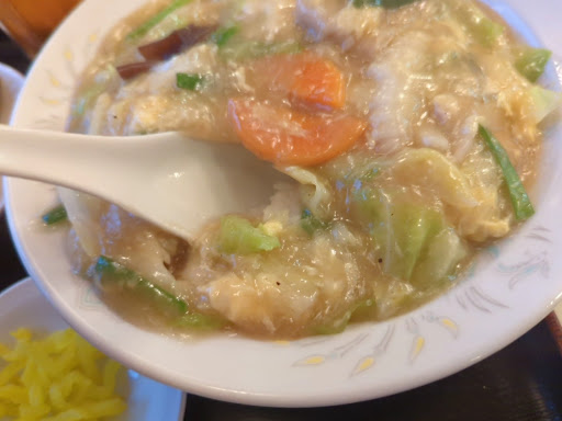 Read more248号線沿いの南公園近くの コスパの良い老舗の中華料理店。 昔ながらのメニューで、 コスパの良くて優しい味付です。 中華飯のシュウマイセットを 注文しましたが、 シュウマイが売り切れでした。 代わりに春巻セットを注文しました。 相方は天津飯餃子セットで、 どちらも700円台で ボリュームがありました。 中華飯と天津飯の餡は 塩味ベースで優しい味付でした。 餃子の餡は野菜が多めで、 キャベツの食感とニラの味が アクセントとなり、 最後まで美味しく頂けました。 春巻セットは春巻が2本あり、 餡は具材が多くジューシーで 食べごたえがありました。 量もお腹いっぱいでしたので、 次回はシュウマイとラーメンセットを 食べてみたいと思い...