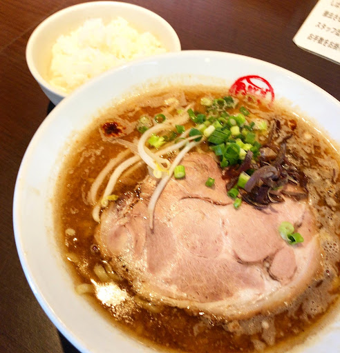 豚骨醤油ラーメン720円を中太麺、硬めで。ランチタイムライスサービス頂きました。