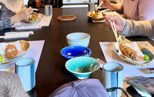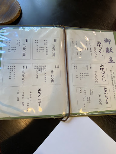 -sesame tofu -koniyaku with miso mustard -potato mountain yam (really lovely) amago (red spotted river trout) in 2 ways = with batter & shio (salt grilled) this the best trout I had in both preparations the batter one is better gohan- rice with pickles and red miso matsutake soup musk melon