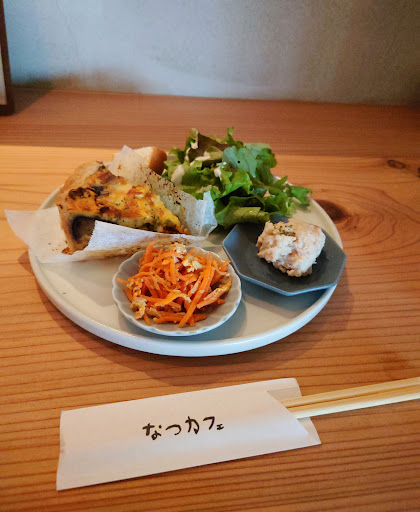 Read more先月OPENしたばかりのなつカフェさんへ行って来ました 午前中用があり、着いたのが12時過ぎ… 11時半からランチなので、店内ピークの時間だったらか駐車場がお店の前も裏も満車。 お店の周りの道をぐるぐる回ってその間にお店前の駐車場が空き、何とか停める事が出来ました。 ひとまず安心。 お店に入ると満席だったので名前を書いて暫く待つ事に… 5分程待ってすぐに呼ばれました お店に入るとオシャレでステキ過ぎる空間。 満席だったので最初は店内を見渡す事が出来ませんでしたが、13時前になるとテーブル席のお客さんは帰られたのでじっくり見ることが出来ました ランチメニューは『選べるキッシュプレート』1種類のみ。 キッシュは2種類から選ぶ事が出来たので、珍しい肉みそとなすとネギのキッシュにしました。 プレートにはサラダと副菜2種、パンが盛り付けられています。 キッシュが凄く美味しくて感動。 キッシュを家で何度か作った事があるのですが、中まで火が通らなくて成功した事が1度もないので、キッシュはお店で頂くものと思っています(笑) キッシュメインのランチがあるカフェが出来て本当に嬉しい。 本日のスープはじゃがいものスープカレーだったかな。 こちらもとても美味しかったです。 ランチの後は楽しみにしていた焼き菓子のデザート。 デザートは別腹なので3種類も頼んでしまいました。 チーズケーキサンド、季節のタルト、さくほろスコーン、レモンカードクリーム。 まず、最初に食べたのがチーズケーキサンド。 サンドしたまま食べようと思ったら、チーズケーキが柔らかくてクッキーが硬いので上手く割れない。 上のクッキーを取り、別々で食べる事で解決しました(笑) 季節のタルトはさつまいも。 こちらは見た目が可愛い。 スコーンはスコーンに付けるレモンカードクリームが美味しくて感動✨ たっぷりの量でしたがスコーンに沢山付けて、あっという間にに完食。 ステキな空間で美味しい焼き菓子とドリンクが頂けて大満足でした。...
