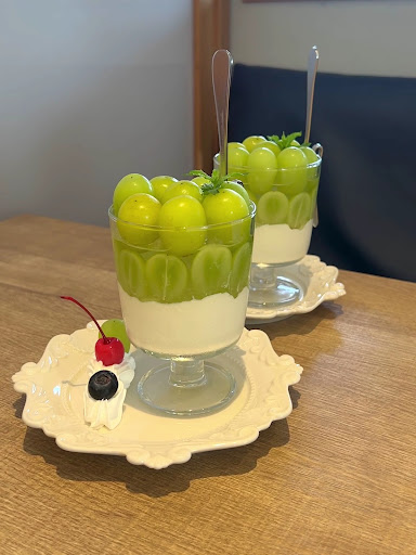 大粒のシャインマスカットがいっぱい♪ 甘くてぱっつんぱっつんで美味しかったです。 お皿にはクリームとブルーベリー さくらんぼが飾られていて 下には滑らかなパンナコッタとレモンジュレ。 全体的にさっぱりと食べれました♡ こういうパフェ好き。