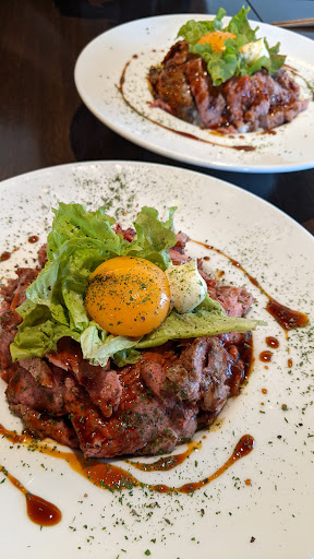 日曜日18時の急な電話でも予約できました。 店内はおしゃれで落ち着いた雰囲気てす。 ¥2700コースを頂きました。 マグロとアボカドのタルタルは、一番のおすすめだそうですが、すごくおいしかった。一番好みでした。マグロの漬け、アボカド、わさびのタルタルが絶妙な組み合わせ&わさびでさっぱりしています。 桜海老のぺぺロンチーノは、想像以上に桜えびのいい香り。それに負けじとバジルが主張。すごく難しいバランスで繊細さを感じます。 ロースステーキは、ちょっと肉は硬めですが、アメリカで食べるステーキステーキソースそのもの。これもビールがすすみます。 ロービーロールは、以外に肉の味はしないけど、カニカマと甘めのタレとわさびが絶妙な組み合わせです。 焼酎 大和桜もなめらかで飲みやすく、こちらの料理とよくあいます。 どの料理もありきたりでなく、メリハリつけて特徴ある料理に仕上がっています。どれもソースが絶品。料理を何段階もレベルアップさせていると思います。 ボリュームもしっかりあります。全体的に野菜も多く、女性にも喜ばれると思います。また、一つの料理を分け合って食べるので会話も弾みます。デートにも記念日にもなんでも使えるお店。一つのコースで、こんなに多国籍の料理が楽しめるところはあまりないと思います。 初めてならおすすめが組み合わさっているこのコースがいいですね。 料理の提供もスムーズで、タイミングよく提供してくれます。 お店の方の接客も、さらに気分を高めてくれます。 口コミを見て頂いてわかって頂けると思いますが、いろいろなお店を伺ってますが、私はここまで満足するお店はなかなかないです。今度は、娘達を、連れてまた行きますね。 さっそく娘を連れてランチもお邪魔しました。チキンテリヤキ丼1430円、ロービー丼1705円を頂きました。どちらもすごくおいしい。夜同様、お店の特徴あってここでしか食べれない料理。これにサラダやスープ、デザート、ちょっもしたドリンクバーも付いてきます。すごくお得なランチでした。