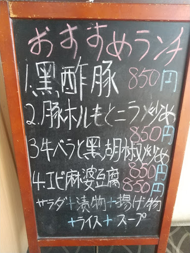 初訪 祝日の開店直後に一番乗り。 日祝でも通常のランチメニューは有り難いね。 黒板から黒酢酢豚(850円)をチョイス。 肉も野菜も小さなカットですが、しっかりボリュームはあります。 小鉢の唐揚げは一つだけど大振り。ご飯はカウンターのジャーからセルフでおかわり自由。 接客は感じがよく、帰るときに厨房からご主人が挨拶してくれました。 ものすごく美味しいって訳ではないけど、旨くて安くてボリュームがあって感じが良い。 ...