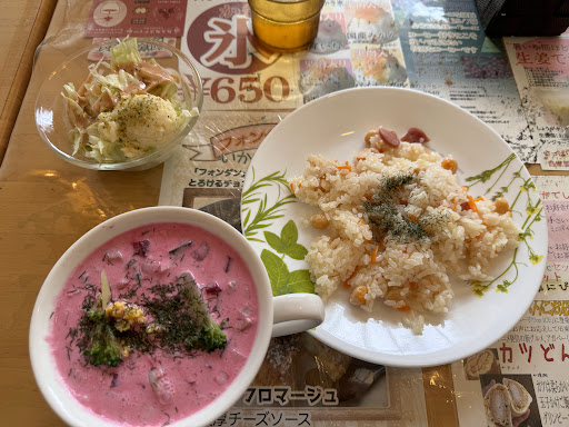 Read moreかねてより食べてみたかったボルシチを食べるべく訪問しました。 かなり暑い日だったので、冷製ボルシチを頼んでみましたが、色がすごい。 正直食欲をそそる色ではない。 とは言えチャレンジしないことには始まらないということで、まずは一口。 とにかくまず思うのは野菜のざくざく感。サイコロ状に切っている野菜がゴロゴロ入っており、スープと思いきやざくざくした食感。肝心の味はというと、酸味が強い。気分的にはドレッシングを直飲みしてる感覚で、残念ながら自分の口には合いませんでした。 豆のピラフはあっさりした味付けで、てっきりガーリックをかなり効かせているのかと思っていましたがそんなこともなく、あっさりした味わいで食べやすがったです。