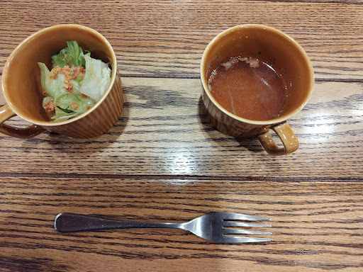 ランチタイムは全てランチコースで、サラダとスープが付く。サラダのドレッシングが美味い。