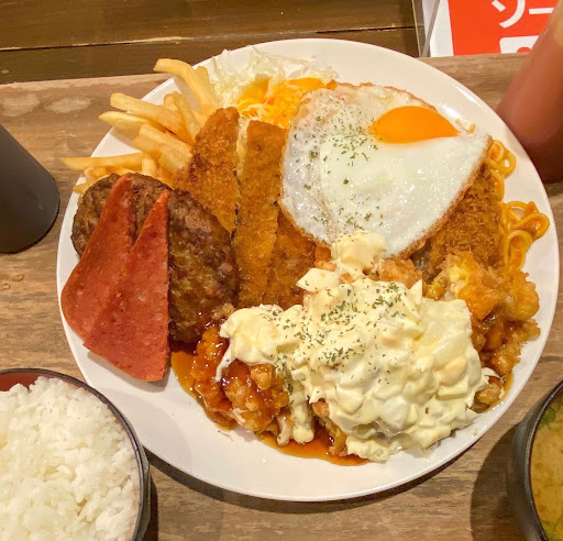 タルタルソースたっふの チキン南蛮にトンカツ ハンバーグ、ポークに ナポリタン目玉焼きに ポテトにサラダ、、 ご飯に味噌汁
