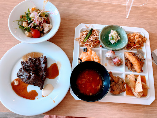 We enjoy coming here because they can accommodate bigger groups and families. The food is good and the price is reasonable. Theyâve got good steaks and offer a variety of dishes from other countries. The entrance to the hotel/restaurant is unique and offers a nice okinawa picture op.