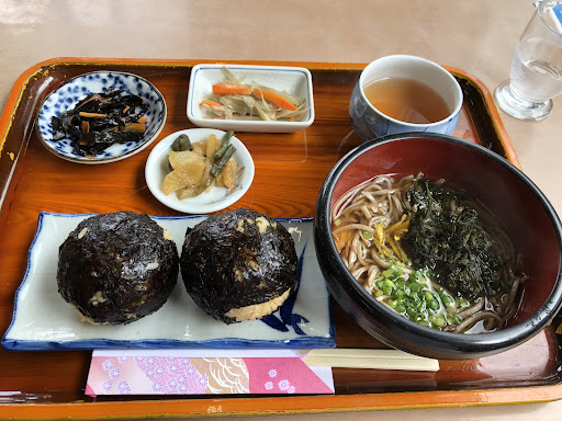 Read more位在水若酢神社後方,與五箇創生館為一體式建築,從西鄉港出發,環島半圈的話到這個位置差不多可以吃午餐。整份定食帶有樸實的家常感,左上角的小菜是某種昆布,不過口感很難用脆或軟來形容,第一次吃到這樣的昆布。飯糰有紫蘇梅和海帶兩種口味,海苔帶有醬油味,靠近海苔的部分鹹淡適中,到了更深處則有內餡提供鹹味。蕎麥麵是這裡的招牌,看說明是職員手做的蕎麥麵,湯頭是淡淡的味噌,還有魚乾在湯裡,帶來口感變化的同時,也為湯頭提供更深層的味道,在上面點綴的柑橘類表皮具有清新的香氣。整體來說就是家常料理,但在細節處理的很用...