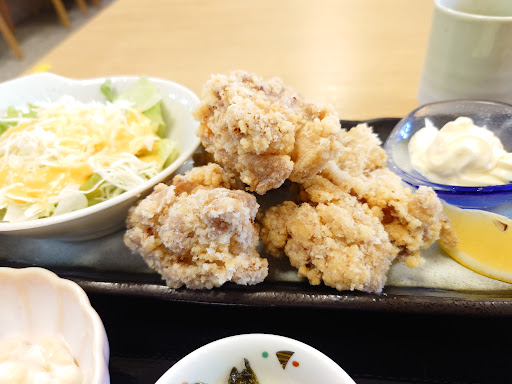 平日のランチで訪問。 今回の飲食店でほぼ大熊町役場周辺は完了です。 付近はまだまだ復興には程遠いですが、確実に前に進んでます。 12時だいぶ前に入店すると、テラス席が賑わってましたが、店内はまだ誰もお客さんはいません。 ちと心配になりましたが、間もなくワサワサとお客さんが入店してきました。 鶏唐定食を注文。 大きさも程よくジューシーで味付けは自分的には軽く感じたんで、ソースで味変しました。 ご飯が何気にモチモチ炊き立て...
