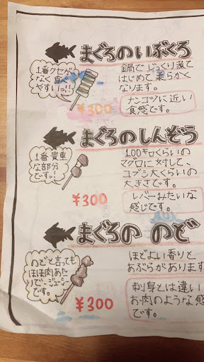 Read more本物の漁師さんがやってるお店。船の名前は開運丸。夫婦船です。そうここの奥さんは最高です!!周りの商売っ気まんまんのお店と違いまったくそれがない!性格も心も商売ものしかたも超キレイ!!!!夫婦船で北の海をあちこち周られ漁をされているのでこのお店に立たれる時期は限られています。人生でなかなかこんないい人に出会うことないです。旦那さんも海の男ぽさはありますがカッコいしやさしそう!!!北の名と船の話は感動したな~😭😭😭 そうそう肝心なことを書くのをわすれてました。ここで食べれるマグロの喉と胃袋と心臓の炭焼き!!!激旨ですマグロが水揚げされる地域でしかたべれない珍味なのかな?ここでビール飲めたらもう最の高です!熊本から来てる一見さんにも関わらず気持ちよくご対応していただきこころからありがとうございました。気持ちが晴れやかになる女将さんです!すばらし...