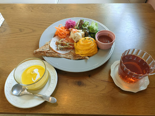 他県から味噌を買いに近くに来て帰りに寄るカフェを探し、ぷりんねこ が気になって(他の写真も美味しそうだったし)月曜日14時過ぎに一人で訪問しました。お腹をすかして行き、よくばりセット(ガレット、サラダ、オムライス、スープ、ドリンク)とぷりんねこを注文。先客は年配のマダム集団。お好きな席をと言われて 集団と別のサイドのソファに行きました。ゆったりできる雰囲気😊注文したセットにはドリンクが付いていたのですが、アールグレイ、フレーバーティー、カフェラテ、オレンジジュース、グレープフルーツジュースなどなど もっといろんなものから選べました。トイレも綺麗でした。スタッフの皆さんもみんな優しい感じでした。メニューも雰囲気も...