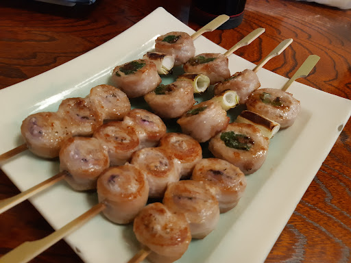Read more出張先で☆ 串焼きなのだが、焼き鳥屋とは少し違う感じの、豚バラで巻いてある品が多いお店!w 独特の、黒い醤油ダレと酢味噌ダレみたいのが置いてあり、好みで最初にタレか塩を選び、さらに味変出来るタイプ☆ 個人的には塩に酢味噌ダレみたいのが良かったな♪ 途中から酒も進んで撮り忘れてるけどw 個人的に大好きなウズラがイチオシかな〜w ニンニクも美味しいし、ま、とりま...