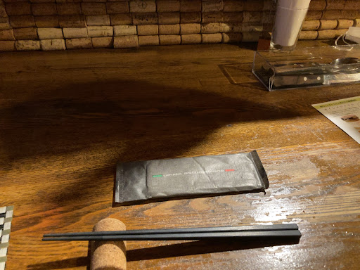 ・店内 広くないですが、個人的には狭いと感じませんでしたしいい雰囲気でオシャレでコルクをたくさん使った印象的な内装なのは好きです。 予約した人が行けるのかはよくわかりませんが店の奥の方に廊下が続いているのが見えてワクワクしました(私たちは入口付近のカウンター席に座りました)。 ただ、席の目の前のカウンターに置いてあった小さなガラス容器に爪楊枝が数本入ったものが他のお客さんの使用済みなのを想起させてちょっと気になりました。 あと目の前のカウンターに陳列されている瓶がオシャレなのはいいですが、埃が薄く積もっていて気になりました。