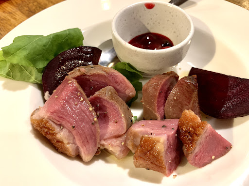 メインの京鴨ローストも柔らかジューシーで良い感じ。低温調理器で火を入れて最後に皮目だけフライパンで炙った感じかな?個人的好みはオーブンでもう少し焼いて水分をもう少し抜いて旨味凝縮された方がより好きではありました。