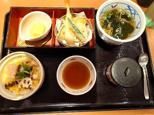 Read more注文はタブレット。 会計もセミセルフ。 ランチタイムが15時までなので有り難い。 普段は日替わりにするが今回は、暑さもありちらし寿司がついた御膳に。 しかし、ちらし寿司のご飯は酢飯ではなく温かい白ご飯でした。天ぷらは揚げたてで美味しかった。 店内の冷房が全く効いておらずかなり暑く、扇子やうちわで仰いでいるお客様が多かった。ドリンクバー、アルコールバーがあるが店内が暑い...