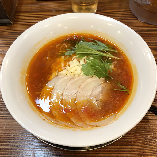 レンゲですくったスープはトマトスープらしい赤み・・というより透明感があるのはオイリーな上澄みだからかな さっそくいただきまーす(^O^)/ お~これはウマい♪ 色合いから薄味を想像してたけどトマト果肉もたくさん溶け込んでるようで、がっつりトマトの旨味を感じられます 追加トッピングのチャーシューは薄めだし淡白な味わいなのでトマトスープにとても合ってます オリジナルのとまとラーメンにはチャーシューは1枚も入ってないみたいだから追加して大正解! 溶けかけたチーズの下から引き揚げた、かん水多めな雰囲気の麺は細めのちぢれ麺 トマトスープの絡みもよくてめっちゃ美味しいです♪