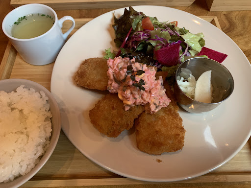 Read more木造りの雰囲気のいい建物、内装。 お店の方女性お2人とも明るく感じ良く迎えてくれました。 一階の窓に面したカウンター席がナイスビューを目の前にできて良かったのですが、先客ありだったのだ、2階に行きましたが、2階からはナイスビューは見えませんでした(窓の構造上の問題で😂) お魚ランチをチョイス。 松浦アジフライが3つ。タルタルソースも美味しいし、アジフライは肉厚でふわふわ♡ 付け合わせも野菜たっぷりで美味しかったです。次はお肉ラ...