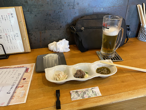 日曜日、18時30分に入店。まだ2組しかいなかった。カウンター席が7席とテーブル席が2つの最大でも17、18人しか入れないこじんまりとした店を2人で切り盛りしている。魚が売りということで、刺し盛を注文。クジラまで入っている刺し盛だったが、言われた通りどの魚も非常に美味かった。ウニが乗ったゆで卵やアジの練り物のさつま揚げも美味かった。タコてんぷらは今一だったが全体的にどの料理も美味く楽しめる。ただ、残念なのがタバコが非常に気になることだ。客況は殆ど馴染みの人のようだが、殆どの人がタバコを吸っている。狭い店の中、せっかく美味しい料理に水を差す。☆4つとすべき店だが、客のたばこで☆3つになった初めてのケースとなった。19時には殆ど満席になり、次から次へくる客を断る...