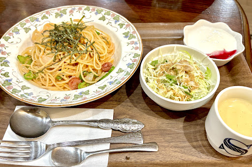 明太パスタ、サラダ、ヨーグルト、コーンスープ、コーヒーまでついて1100円ぐらいだったはず・・安すぎるって😭 明太子玉ねぎピーマンウインナー刻み海苔もはいってて サラダのキャベツも極細切りでシャキシャキ 手作りコーンスープ(ドリンクバーにあるやつじゃないちゃんとしたやつ) ヨーグルトも好みのカスピ海ヨーグルトで ちゃんと美味しいコーヒー・・