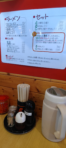 大牟田市通町、「通町二丁目」交差点傍にあるラーメン屋です。小さめの店舗で店内も狭めですが、カウンター席·テーブル席·小上がり席がぎっちり詰め込まれています。駐車場は店横に4台分確保されています。さてラーメンですが、最も基本となるのが「豚骨ラーメン」となります。白濁こそしていますが、豚骨感弱めのどちらかと言うと博多系寄りのとんこつスープとなっています。ゴマの風味が強く、遠くにニンニクが感じられる不思議な味わいですね。麺は細麺ストレートでプリプリ感が楽しめます。具は小さめのトロトロ系チャーシュー、キクラゲ、ゴマ、ネギといった構成の一杯です。大盛り対応あり、替え玉制あり、各種トッピング対応ありとなっています。ラーメンのバリエーションは「豚骨味噌ラーメン」「豚骨醤油ラーメン」やトッピング違いの数種類が用意されています。サイドメニューは「やきめし」と「大餃子」とアルコール類程度、一応セットメニューもあるのですが…。 メニュー表をよくよく見るとわかるのですが、セットメニューの「やきめし」の小サイズはお一人様では注文出来ません。初見で単純に「Bセット」(やきめし小)を注文したのですが「やきめしは中か大になります」という説明の一点張りで、軽く混乱してしまいました。後から来る客も2件続けて同じ対応&反応だったので面白かったです。と言うより何とかなりま...