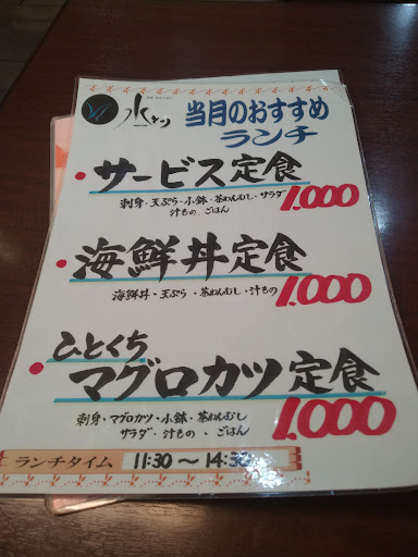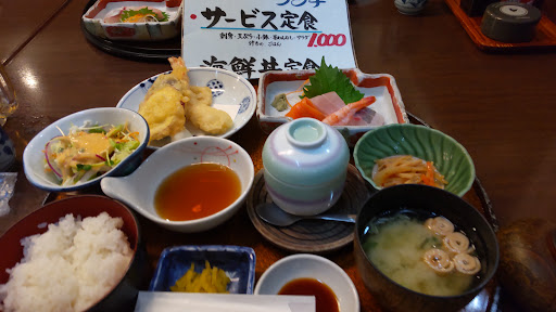Read more福岡県帰省時に必ず来店。今週だけで、支店、本店に行きました。本店には大きな生け簀。関サバ、関あじ、ヒラメ、カサゴ、イカなど、時期に合わせて、多種多様な地魚がたくさん。小さな子供達にとっては、ちょっとした水族館。勿論、料理は地魚料理が主流、値段もお手頃、子供からお年寄りまで客層は幅広い。店員は正しく教育されている、挨拶、会話力は勿論、無駄な行動、店員間の無駄な会話も聞こえない。本店(独立店舗、駐車場広い)、支店(ホテル内)では、本店の方がメニューか豊富、味は同じ。大人2名飲食で、夜は8,000円程度、平日ランチ(写真)が魅力、刺盛り、エビ2本野菜天麩羅などなど1000円。昼も夜も満足、満腹...