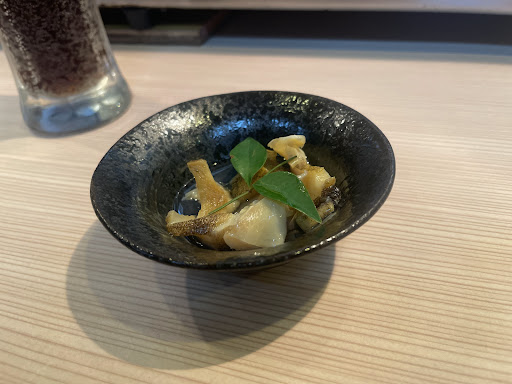 【お通し】 お通しの鮑が美味しくて期待高まっちゃったね。 雑味がなく「純」って感じで、メインへの下地作りとしては100点だね。 うん、100点。