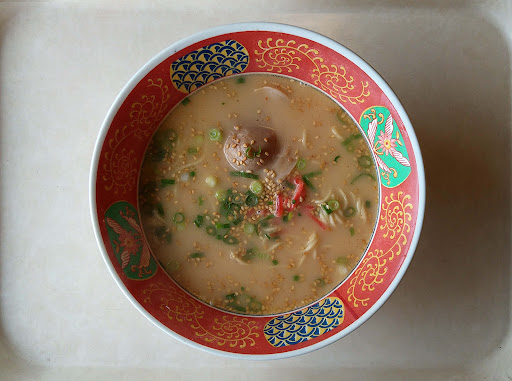 Read more大牟田市北磯町、「北磯町」交差点角地の集合店舗敷地内にある食堂です。大型の店舗で、店内はテーブル席が多数用意されています。駐車場は周辺の店舗と共用で敷地内に十分に確保されています。入口付近でトレーを取り順々に好きなおかず類を取りながら進み、最後にごはん類や汁物等を注文し会計を行うシステムとなっています。お茶、水、箸等の準備や下膳等は全てセルフとなっています。さてラーメンですが、こちらでの取り扱いは「豚骨ラーメン」となっています。先に述べたごはん類や汁物類を扱うコーナーで注文可能です。甘じょっぱいやや平坦な味わいオリジナルのとんこつスープとなっています。麺は中細ストレート麺が使用されています。具はチャーシュー、胡麻、紅生姜、ネギといった構成の一杯です。特徴が少ない食堂系のラーメンなのですが、390円という驚きの価格設定となっています。大盛り対応なし、替え玉制なしとなっています。ラーメンのバリエーションも存在しません。その他の麺類は「野菜たっぷりちゃんぽん」「激辛ちゃんぽん」「海鮮ちゃんぽん」「焼きそば」「皿うどん」そしてうどん·そば類等が扱われています。その他のメニューは、作り置きの一品料理はやや少なめな印象ですが、カレー類や丼物それから定食類が豊富に用意されています。 こちらのお店は、飯塚市伊川に本社を置く「株式会社フジワ」が展開する大型食堂チェーン店です。「モーツァルトの流れる元気の出る食堂」でお馴染みですね。10時の開店直後から、近隣のおいちゃんやおばちゃん達が次々と来店され、賑わっておりました。つまりそんな感じのお店です。因みに、福岡県内を中心に20数店舗展開されているのですが、ラーメンを扱う店舗は...