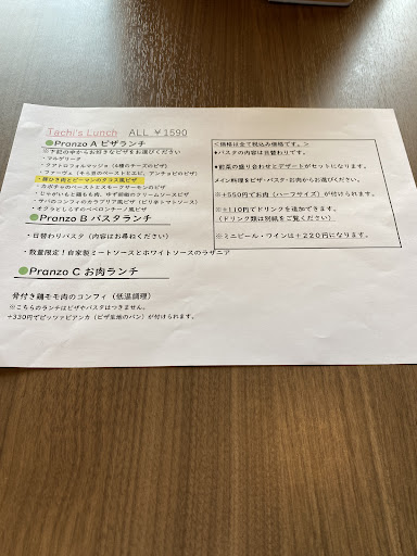 2022年1月29日 久しぶりに、【Italian dining TACHI】さんにお世話に成って来ました。私が、今、知っているピザ🍕屋さんの中では、1番美味しいと言っても良い位美味しいです😋西鉄大牟田駅🚉西口より徒歩🚶♀️5分位で着く場所にお店はあります。駐車場は、2か所あります。駐車場が、2か所共に満車の場合には、近くにあります駐車場をご利用下さい。そこの駐車券をお店の方にお見せされたら¥100位頂けたのではなかったかと思います。今回も明るくてテキパキされています若い店長さんの奥さんに、この日のお勧めメニューをお尋ねさせて頂きまして、【Pranzo PIZZA...