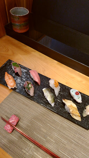 九州出張です 一通り仕事を終えて 食事をご一緒にとのことで こちらのお店へ伺います カウンター席に座り生ビールで乾杯 料理は大将のおませで出てきます 『天然鮃の南蛮漬け』 ほっこりと揚げた肉厚の鮃に ほどよい酸味のタレと野菜が 美味しいです! 『タコの吸盤焼き』 タコの吸盤の串焼き コリコリ食感とうま味が良いツマミです! 梅肉をつけていただくと美味しいです! 『鯛の昆布〆』 口に入れると鯛の濃厚なうま味が拡がり 昆布の風味が後味で追いかけてきます 『かんぱちのお造り』 コリッとした食感とうま味が凄いです! 一切れは小さいですがうま味を楽しむには 十分な大きさで計算されてるなって感心します 『あわび、しゃこ、からすみ』 あわびは火が入っていて柔らかく 甘めのタレが素材の良さを引き立てます しゃこも美味しく九州醤油とあいます からすみは程良い塩気で良いツマミです! 『茶碗蒸し』 かしわの出汁が感じられ とても上品だけどうま味を感じられる 美味しい茶碗蒸しです 『焼き物3種』 鰆の西京焼き、筍、生麩 どれも春を感じられる逸品です とても丁寧な仕事が見てとれ じっくり熱燗をいただきながら味わいます 『握り』 8種の贅沢な握りです トロ、ぶり、海老、しめ鯖、いかのウニのせ タコ、穴子、鯵 どれも絶品です! 特筆だった握りは いかのウニのせは炙ったいかのうま味と ウニの濃厚なうま味があわさり絶品! うなぎ?って思うほどの肉厚の穴子 芳ばしく焼き上げて程良いタレが たまりません! 堪能しまし...
