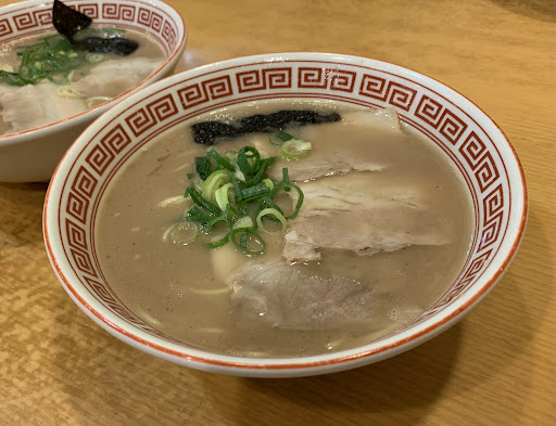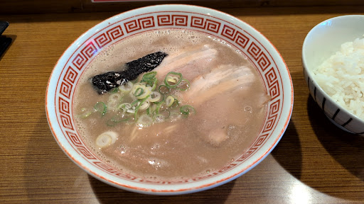 Read more元祖大牟田ラーメンを謳う同店、駅前という絶好の立地に紅いインパクトある看板が嫌でも眼に付きます。店内はテーブル席とカウンターがあります。味気ない券売機等は無く、スタッフが注文を取る昔ながらのスタイルに好感が持てます。平日の13時30頃に立ち寄ったのでお客さんは少なかったです。一番人気の半炒飯セットはやめて、ラーメンの味が引き立つ様に白ご飯にしました。ラーメンは¥700-、ご飯は¥190-、無論替玉(¥150-)にしました。茹では固麺です。テーブルには紅生姜と辛子高菜、ニンニクパウダー、胡椒があります。待つ事数分で提供されました。チャーシューと刻みネギだけと極めてシンプルなラーメンです。麺は細麺プラスアルファ程度の太さ、スープは白濁のがっつり豚骨です。少しとろみのあるスープは濃厚ですが豚骨臭くもなく、塩味の効いた力強い味です。シンプルなだけに誤魔化しが効かない。自信の現れでしょう。 美味い。それ以上の言葉はありません。とにかく美味いのです。替玉したがまだ食べ足りない位に美味い。スープも含め完食です。久しぶりにこんなに美味しい豚骨ラーメンを食べました。長浜系より少し濃い味です。スープは最後に豚骨が残りますが、それが過ぎたる事も無く、がっつり豚骨が苦手な方でも食べられると思います。 大牟田で何軒か巡りましたが、やはり此方は抜きん出て美味しいです。食べに来る価値があります。駐車場は店の横に2台止められますが、前の通りはパーキングメーターが4〜5台ありますので、そこを利用するのも手です。パーキングメーターの領収書を持って行けば餃子一皿サービスして貰えます。または食事代金¥500毎に¥100の割引(上限¥300-です)という大盤振る舞い。少食な方は割引を選択すると良いでしょう。本当に...