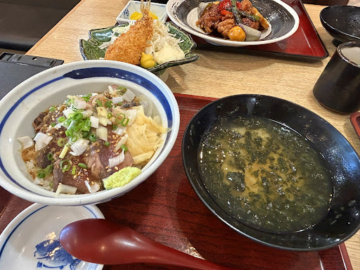 Read more平日、唐揚げ食べ放題定食の看板を見て入店しました。 ご飯、味噌汁、唐揚げが食べ放題でおかわりは個数を告げると揚げて持ってきてくれるようです。 利用時間は見つけれませんでしたがのんびり食べても30分位で十分満足出来ました。 たまたまかもしれませんが店員の態度に‥でした。 後日祝日に訪問するとお客さんも沢山いて店員さんも多かったのでよく回っていまし。 今回は玉手箱を注文、6つの中から選べる3丼(ミニ)今回はヅケ、天丼、海鮮をチョイス。 現在は少食なので2つで既に満足気味。 とても美味しかったです。 偶然にイオンアプリでソフトドリンクが1杯サービス、コーンスープを頂きました。お味噌汁はおかわり可能...