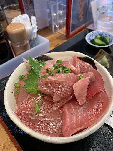 Read more初訪問。鮪の甘みはもはやスイーツ♡スーパーや回転寿司の鮪が苦手な私としては不安もありつつ「船主直営店」を信じて来店!土曜の12時なので並ぶのを覚悟してたら、店前のメニュー写真で迷ってる内に5分もせずに案内される。カウンターに通され着席。荷物置き籠もあって助かったが残り2個で私とツレ1つずつ使って次の客の分が無くなってしまう。三色丼だけで値段にも差があり悩むもせっかくなので特上を選択!若い店員さんテキパキと良く動き気持ちが良い接客をしてくれる。水はセルフと書いてあるけど水を欲しがる客に嫌な顔せず水を持って来てくれる。着丼も早い。さすが特上だ旨い!!鮪苦手な私だが赤みが旨い鮪は好きなのだ。みなみマグロの赤身2枚•トロ2•ねぎとろ•ビンチョウ2枚の満足な内容。切り身も大きめで2口で食べた。酢飯もちょうど良い酢加減だし温度も良い。写真よりも小さく感じる丼だが私にはベストサイズ。よくある丼は大きいのに玉子焼きやらカイワレ大葉で誤魔化しているのに比べれば内容量は、充分。コレで1800円なら安い♪味噌汁も旨い!付いてきた自家製胡瓜漬けも優しい味で大満足♡鮪の脂が甘〜い♡いつまでも噛んでいたい。飲み込む別れがツライ。この甘さは...