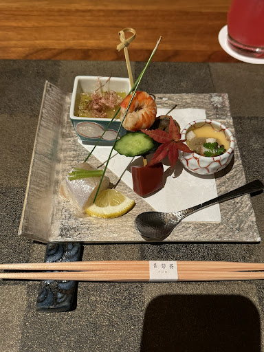 A Plate of 5 amouse bouche: Egg plant was smoked Conger eel was ok Konjac was really interesting, cucumber and prawn was average The egg custard with snow crab and caviar on the top was nice The sea bream was fishy and not that great.