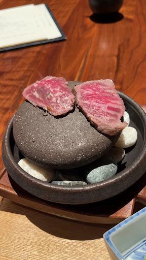 The wagyu beer came with a hot stone -3 pieces of 10-15 grams each with miso sauce. Small portion of rice and miso soup with nameko mushroom which was excellent.