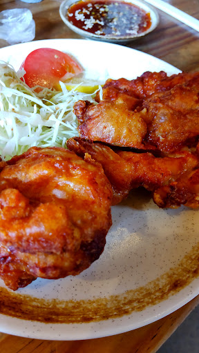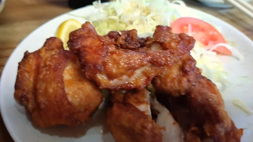 食べやすいように 切れ込みが入れられた、とても大きな唐揚げが 3個 ミニ でも、ボリューム満点 です 素揚げに近いような 薄い揚げ衣は、香り高くて 程よい味付け 香ばしくて、美味しい 皮目は パリパリ・ザクザク、肉身は しっとり・もっちり・ジューシー 風味・歯触り・噛み応え、全てが グッド です これは、なかなかの 絶品ですね 鶏モモ肉本来の 正肉の旨味と皮脂身の甘味 が、ダイレクトに ガツンと味わえますよ やっぱり、唐揚げは “キング・オブ・おかず” ですね 添えてある タレに浸けても、これまた 良し 油淋鶏 的な感じで、ますます ご飯が どんどん無くなります