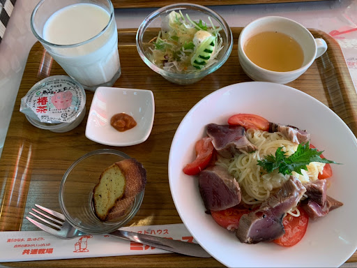 あいにくの雨でしたが土曜日だったため人はそれなりにいて、学食のような雰囲気の食堂で牛乳ソフトやプリン、ガッツリご飯物まで頼む形になります。