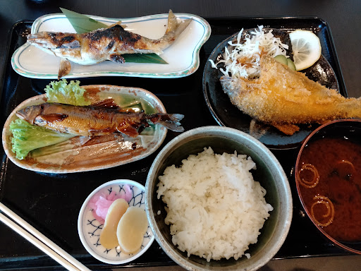 メニューは、やなの鮎料理の様なメニューもありますが、お勧めは鮎まぶし2420円(2025/09)。 塩焼きが3匹と丼のごはん、だし汁、小鉢(松前漬け)、香の物がつきます。 鮎の塩焼きは、化粧塩があまりキツくなく、出汁との相性も抜群です。 化粧塩が強すぎると、だし汁をかけても塩っ辛くなって、せっかくの鮎まぶしが台無しになってしまうからね。