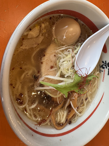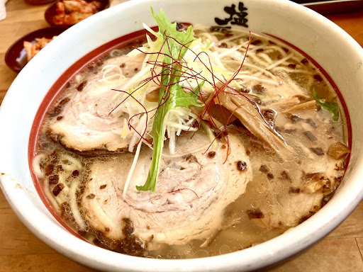 Read more国道沿いの大きな駐車場がある大型店です。 水曜日の13:15頃の到着でしたが外待ちが三組。ウェイティングボードに名前を書いてお店前の待合に座りましたが、お一人様なのですぐに呼ばれました。ラッキーです。 塩元帥は久しぶりなので定番の塩ラーメンと悩みに悩みましたがメニューのこだわり書きを読んで「濃口醤油ラーメン」1,010円税込をチョイスしました。 程なく到着したラーメンは確かに醤油の色濃い濃口なスープの見た目。想像以上に濃ゆい雰囲気です。 先ずはスープをひと口。濃厚な醤油の風味と、塩でも感じたかつお節的な魚介の香りが抜けて行きます。醤油は濃いのに塩味は控えめ。これは美味しい。柚子も入っていますね。 麺は平打ち細麺。ツルッと気持ちよく飛び込んできてプツッと切れて歯切れのよい、とても美味しい麺です。硬さは選べませんがベストな硬さでの提供です。 密かに主役級の大きなチャーシューは厚みがあってトロントロン。濃すぎない味付けで肉感たっぷりで幸せになります。ナルトと海苔は無くても良い派ですがラーメンの邪魔はしません。メンマは見た目の濃さと違ってさっぱりした味付け。このラーメンに良く合います。 美味しくて一気に完食。塩元帥で醤油をオーダーするのは勇気が必要ですが、とっても美味しかったので思い切ってオーダーしてみてよかったで...