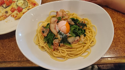 ◯追記(2024.9.5) ランチセットのサラダとスープの具が更に寂しくなったり、お得なBセットがなくなったり、全体的にお値段が上がったりはしていますが、いつ行っても「これこれ!」と思えるちょうど良いスパゲッティとピッツァです。 やはり「すごく美味しい!」という訳ではないのですが、安定感があり、ふとした時に食べに行きたくなる魅力があります。 スパゲッティもピッツァも食べたいけど2人前は流石に…という時は、スパゲッティをメインにしてハーフサイズピッツァ追加という形で調整しやすいのも有り難いです。 また、以前とは違い、ランチ限定の均一価格でスパゲッティ単品、ピッツァ単品という注文が出来るようになったのも良き。 接客はよくも悪くも以前と変わらず、店員さんによってかなり違いますが、決して不快になるものではなく、キビキビして手際はいいです。 先日久々に行った所、ランチメニューから南バイパス店限定「クリーム担々麺」が消えていた為びっくりし、慌てて店員さんに尋ねた所、メニューには載っていないだけで、注文する時に言ってもらえれば普通に用意出来るとのご返答で安心しました。