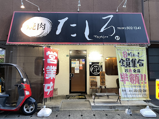 10年地域に愛されている、炭火で極上焼肉を堪能出来るお店、焼肉たしろ大野城本店。 春日店もありますが、特に大野城店、よく前を通るので以前から気になっていてやっと伺えました! 事前に電話で伺ったところ、隣の敷地にある駐車場が2台あるということでそちらに停めてお店の前に。 8時までに予約・受付・入店で肉類全品半額との記載で佐賀牛を使用されているようです。 PayPayでのお支払いも出来るのは良いですね。