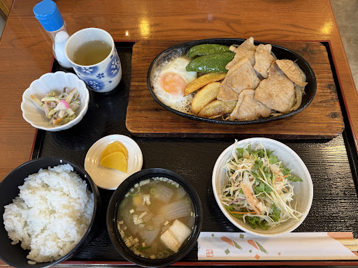 注文したのは「豚ロース定食」で、豚ロース焼きにモヤシ、玉ねぎ、ピーマン、目玉焼き、ポテトが鉄板に盛り付けてあり、小鉢、サラダ味噌汁、漬物、ごはんとてんこ盛りメニューです!