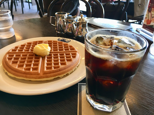 Read more濃い茶色を基調とした広くてお洒落な店舗でした。入口を入るとガラス越しに下階にあるコーヒーを焙煎する大きな機械が見えます。入って直ぐにコーヒーなどが買えるショップがあり、その奥に喫茶スペースがありました。店内は喫煙席と禁煙席に別れてるようで、タバコを吸わないと伝えると庭の見える窓側の席に案内されました。窓側は光が差し込むので明るいですが、店舗内は全体に暗めに感じました。 アイスコーヒーとワッフルを注文。アイスコーヒーは氷がたくさん入ったグラスとサイフォンで淹れた温かいコーヒーを持ってこられ、グラスに注いでアイスコーヒーにして提供されました。 アイスコーヒーはとても飲みやすく美味しかったです。ワッフルはプレーンを注文したので真ん中にバターが乗っていて、添えられたメイプルシロップをかけて食べました。 平日夕方の訪問だったので、...