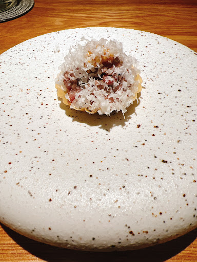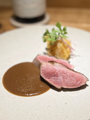 ランチで8品とワンドリンクで7100円のコースを頼みました。店内はカジュアルな感じでとても雰囲気の良いお店でした。その日はイケメン2人がお店をされていました。席はカウンターの1番奥の席でした。お料理の名前が覚えられなくて曖昧で書かせて頂きます。すいません。お料理1品目は1口サイズのお肉のタルタル3年熟成パルミジャーノチーズかけのタルト?みたいな感じでした。タルトみたいな下のやつがパリパリでお肉も柔らかくチーズも濃厚で美味しかったです。2品目は牡蠣とアボカドのタルタル和風出汁の泡のせ?みたいな感じでした。いやいやいや。8品中、開始2連続でタルタルやん。と、ここ減点ポイントで評価が下がりました。大きな岩牡蠣の器に使用したせいか、牡蠣の量が少なくて、牡蠣自体の旨味は無く、アボカドタルタルの味だけな感じでしたが、泡が思っている以上にお出汁感があって、美味しかったです。私自身は、牡蠣の割合が多めの方が良いと思いました。3品目は大羽いわしでナスとネギを挟んだもの?でしたが、初めての組み合わせでとても美味しかったです。ソースも美味しく、副菜の野菜も美味しかったです。4品目は栗かぼちゃの冷製スープ クッキーのせライ麦パンと共に?って感じのものでした。こちらは味自体はめちゃめちゃ甘くて、奥さんは喜んでいましたが、私は甘すぎてその甘さもかぼちゃの甘さというよりは、かぼちゃではない甘さで、甘いスープの上にかかっているクッキーのやつも甘くて甘々のスープって感じでした。暑い時期に、このスープはかき氷にかけたら美味しいんかなぁ?と思いました。パンはめちゃくちゃ美味しかったです。周りはカリッカリで中のパンはふわもちで、香りもとても良くてとても美味しかったです。5品目はタイの焼き物パプリカとサフランソース?みたいなのでした。こちらは野菜のオクラもアスパラも、揚げたおかひじきもどれもこれも美味しく、ソースにマッチして、皮目パリッパリで中ふわっふわの鯛は最高でした!6品目は豚のステーキ。バターソース?でしたが、じゃがいもが少し固かったのが残念でした。豚自体は分厚いのに柔らかく、生のきくらげとバターソースがとても合っていて美味しかったです。豚とバターソースは豚の味を引き立てる感じでとても美味しかったです。7品目はデザートでバニラとヨーグルトのアイス、焼いたいちじくと共に?。みたいなのとコーヒーか紅茶が選べました。いちじくは旬で甘く、バニラヨーグルトのアイスは濃厚ながらもさっぱりとしていてとても美味しかったですが、クッキーみたいなのが、パリパリでもなければしっとりみたいな感じで、アクセントにはなっていなかったので、別にこれはつけなくていいかなぁ?と思いました。8品目は茶菓子で写真を撮るのを忘れてしまいましたが、野菜のパウンドケーキとギモーブとカヌレ?でした。こちらは全て美味しく頂きました。こちらでコース終了でしたが、終始カウンターの1番奥の左側の席は、定員さんが通る度に左側が沈んですごく揺れます。忙しかったこともあり、コース料理中終始揺れていました。ここはめちゃくちゃ減点ポイントでした。トータルでコース料理は美味しいのは美味しかったですが、メインの食材ですら鯛と豚なのでこれで7000円は別にリーズナブルではないかなぁ。僕は高いと思いました。他の人の口コミはハーフコースばかりだったので、ハーフコースならリーズナブルなのかなぁ?と思いました。次はハーフコースで別の席でお願いできたらと思...