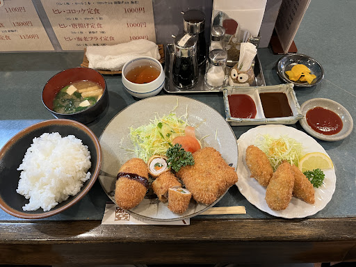 Read more美味しいフライが食べたくて、、、 此花警察署に所用で立ち寄った際に、ちょうどランチタイムとなりました。 付近でご飯屋さんを探します。 商店街もありましたが、googlemapを頼りにウロウロ。 いいのがありました。 老舗のとんかつ屋! 迷わずお店に入ります。 テーブルとカウンターで構成されたお店です。 表のメニューを見ていて、ロールカツは食べたかったので「ヒレロールミックス」をいただきました。 ミックス要素が選べたのでコロッケをお願いすると、クリームコロッケですよとの注意がありました。 願ってもない!大好物です。 注文してから改めてメニューを拝見すると、結構細かく種類があるようですね。 そこで初めて気が付きました、カキフライも単品で頼めるではないですか! 追加でお願いします。 到着したお皿を並べると壮観です。 外れなしのカツのうまさに、カキフライもおいしくいただけました。 クリームコロッケはしっかりとした衣に包まれた 昔ながらのグラタン調の味がしました。 何れの料理も総じて美味しくいただけました。 お客さんは常連が多いようで、この味にひ...