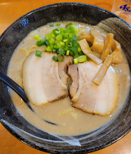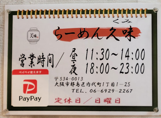 Read more大阪メトロの都島駅から東へ、野江内代駅からのほうが近いあたりにあります、ラーメン屋さんです。周囲のラーメン屋さんは町中華で安価なお店が多い中、ラーメン専門店でやっています。お店はフロアが三角形っぽい不思議な形ですが、テーブル席カウンター席両方ありますので使い勝手は良さそうです。 全部のせの久味ラーメンをいただきました。他の方のレビューにもあるように、某有名チェーン店のような鶏ガラ煮込み系スープですが、こちらのほうが甘みが少なくスッキリしていて縮れている麺によく絡みます。ドライ派な方には好まれそうです。チャーシューは脂身が多く、こちらでこってりと脂の甘味でバランスを取っている感じです。単独でも、ご飯と合わせても美味しい良いラーメンだと思います。 全部のせでも1000円程度なので、お値段も優しく、近くにあると通いたくなる、中毒性のあ...